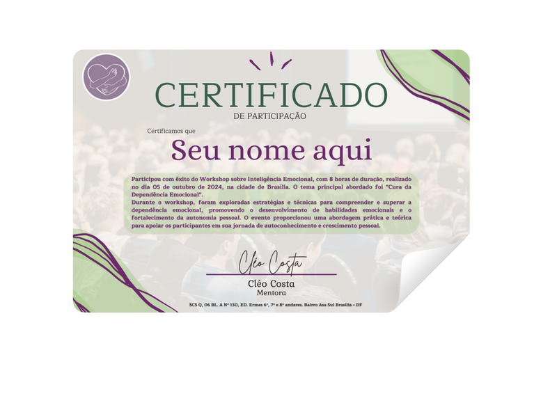 Além de receber a apostila completa no dia do evento, ao final do workshop você também receberá um certificado de participação, que reconhece sua dedicação e esforço nessa jornada de transformação.